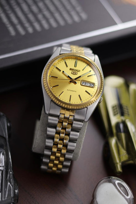 (Super Rare) Seiko 5 SNXJ92 Gold Dial with Fluted Bezel, Two Tone Jubilee Bracelet & Glass Back - Automatic Vintage Watch (Pre Owned) - SE421