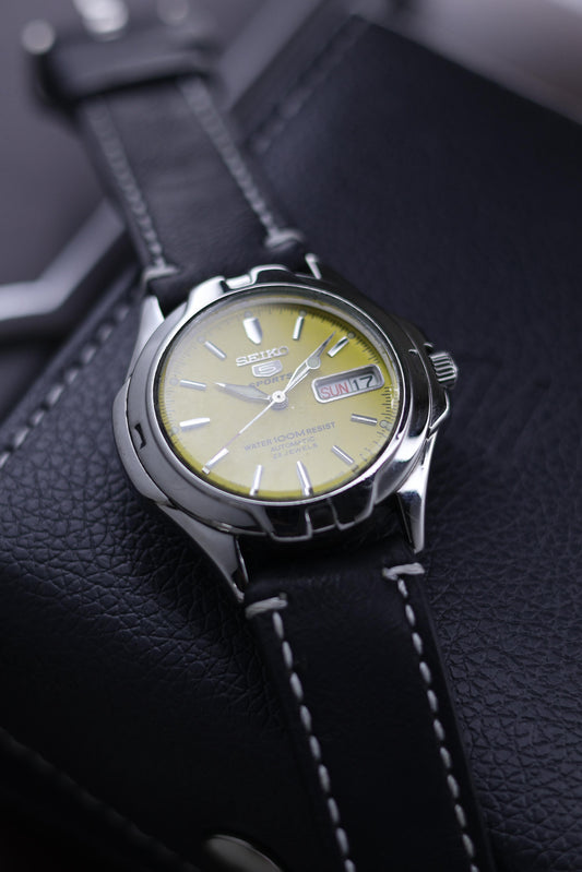 (Super Rare) Seiko 5 Sports Diver 100M Yellow Motif Dial with Glass Back - Automatic Vintage Watch (Pre Owned) - A388