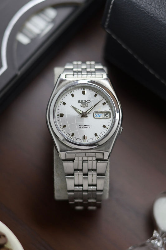 (Super Rare) Seiko 5 Silver Globe Dial with Glass Back - Automatic Vintage Watch (Pre Owned) - SE316