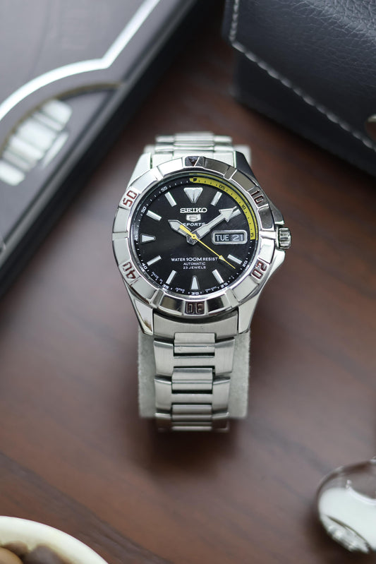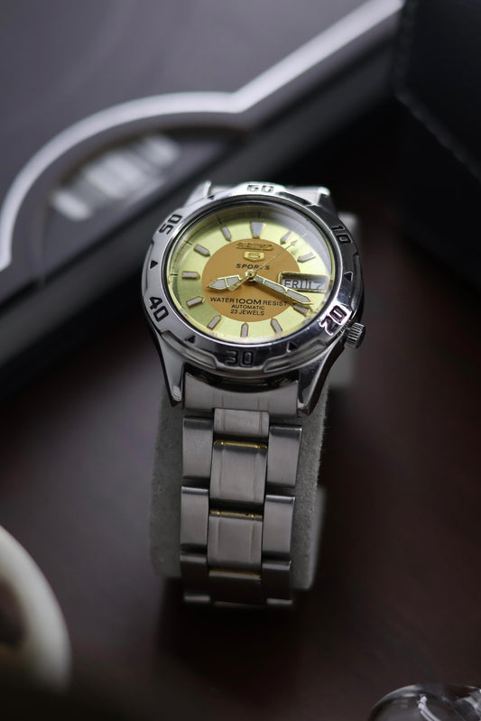 (Super Rare) Seiko 5 Sports Diver 100M Yellow Motif Dial with Glass Back and Rotating Bezel - Automatic Vintage Watch (Pre Owned) - A311