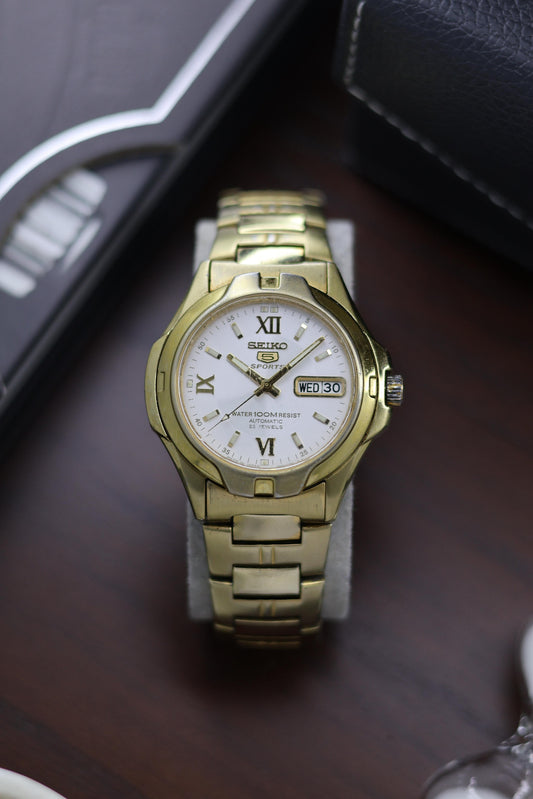 (Super Rare) Seiko 5 Sports Diver 100M Gold Dial with Glass Back - Automatic Vintage Watch (Pre Owned) - A263