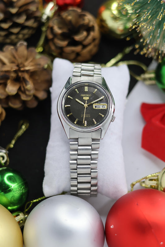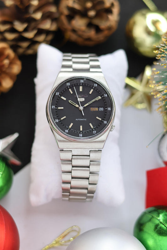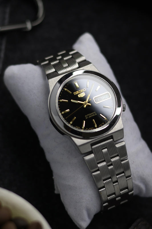 Seiko 5 Black Mirror Dial with Glass Back - Automatic Vintage Watch (Pre Owned)