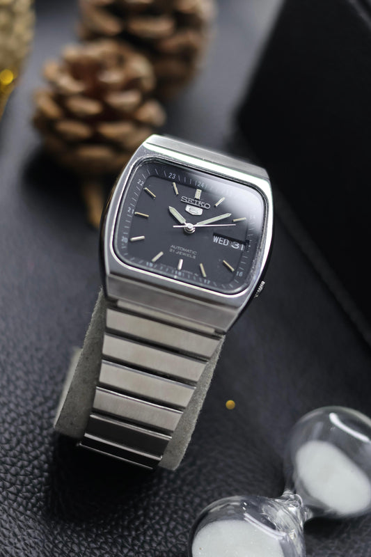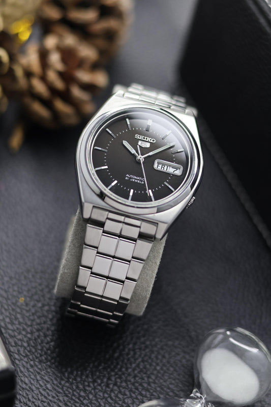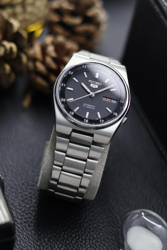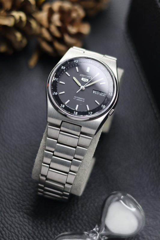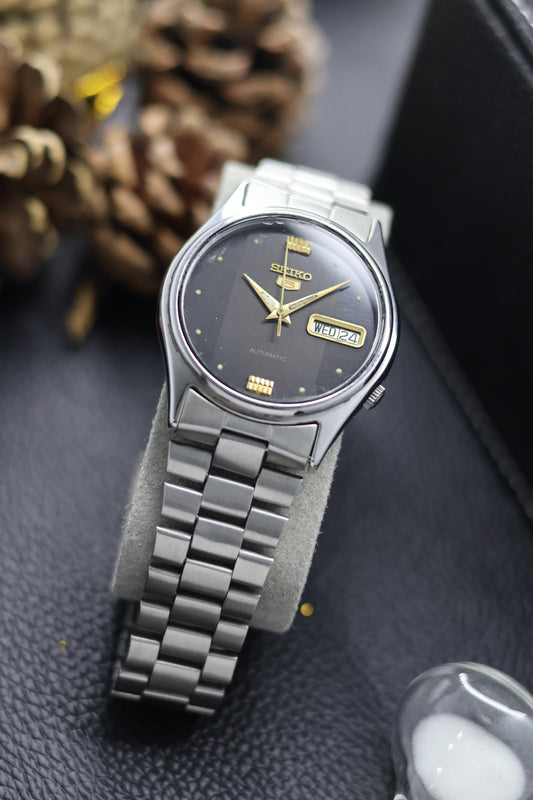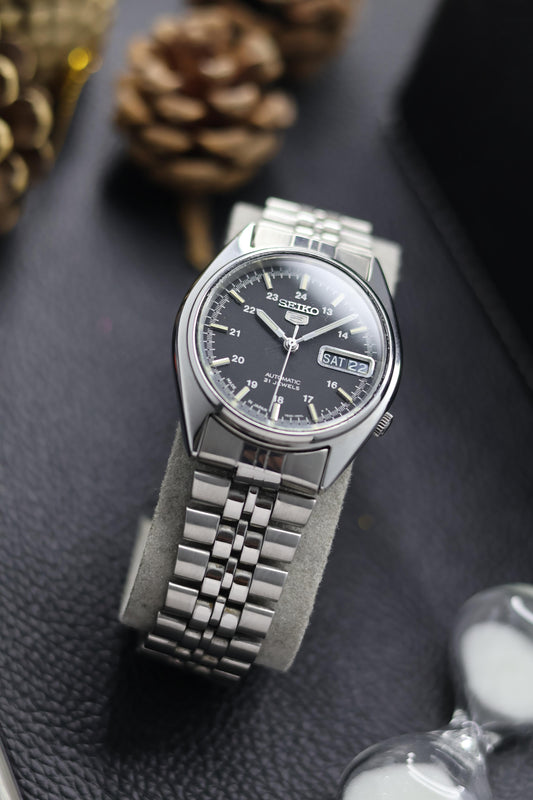 (Super Rare) Seiko 5 Black Lacquered Dial with Glass Back - Automatic Vintage Watch (Pre Owned) - SE673