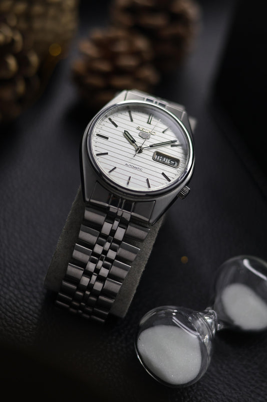 (Super Rare) Seiko 5 White Lined Dial with Glass Back - Automatic Vintage Watch (Pre Owned) - SE600