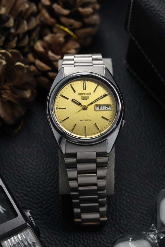 (Super Rare) Seiko 5 Gold Dial with Glass Back - Automatic Vintage Watch (Pre Owned) - SE641