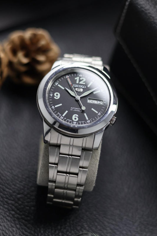 (Super Rare) Seiko 5 Black Field Dial with Glass Back - Automatic Vintage Watch (Pre Owned) - SE619