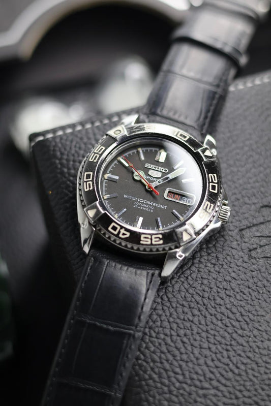 (Super Rare) Seiko 5 Sports Diver 100M Black Guilloche Dial with Glass Back and Rotating Bezel - Automatic Vintage Watch (Pre Owned) - SE572