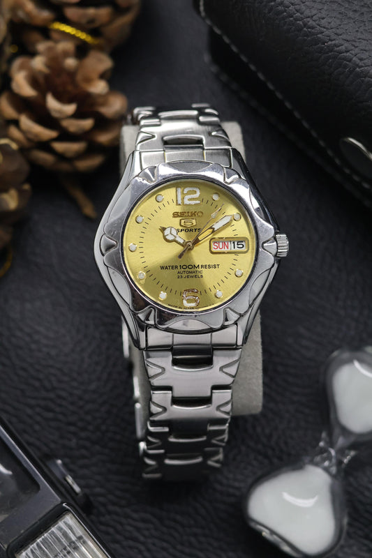 (Super Rare) Seiko 5 Sports Diver 100M Gold Sunray Dial with Glass Back - Automatic Vintage Watch (Pre Owned) - SE642