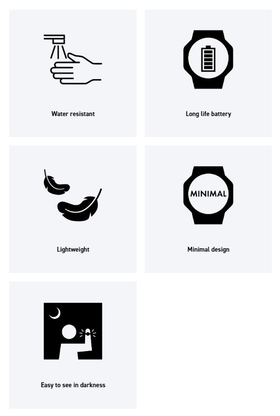 Regular timekeeping: Digital: Hour, minute, second, pm, date, day