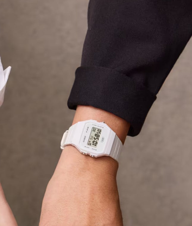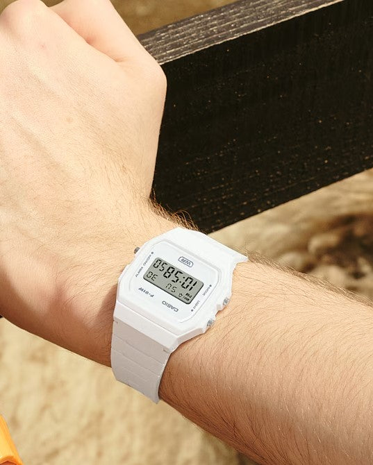 A favorite for decades — the slim, lightweight F-91 with digital LCD now with a minimalist face, fewer mode indicators, and more environmentally responsible materials. The band is made with bio-based resin, a material expected to help reduce environmental impact. Complete with date/day display, alarm, stopwatch and other handy functions, these watches are always at the ready.