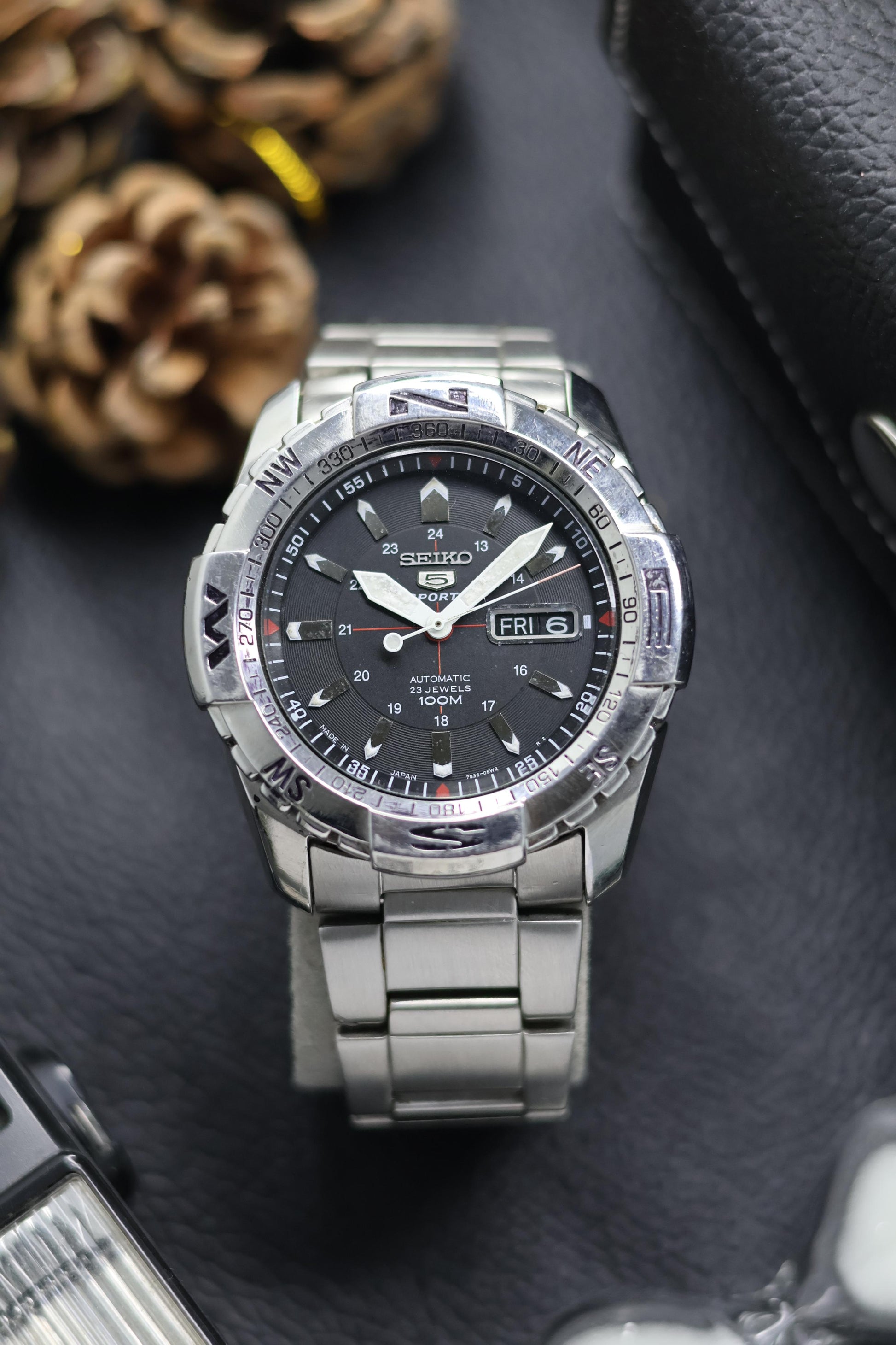 (Super Rare) Seiko 5 SPORTS 44mm 100M WR Black Dial with Glass Back & Rotating Compass Bezel - Automatic Vintage Watch (Pre Owned) - SE647